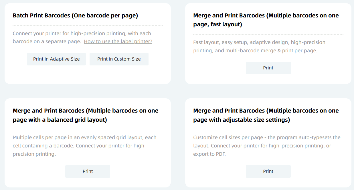 The [Batch Print Barcodes (One Barcode per Page)] function offers two size printing modes: [Print in Adaptive Size] and [Print in Custom Size].