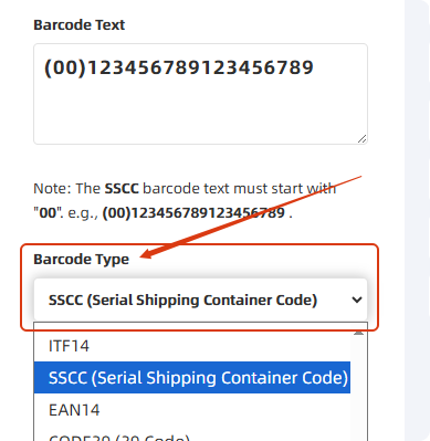 DoingLabel’s barcode generation tools—including the Single Barcode Generator, Batch Barcode Generator, and Label Generator—all support SSCC barcode creation. Simply select "SSCC (Serial Shipping Container Code)" from the [Barcode Type] option in the barcode settings, as shown in the figure below.