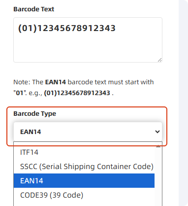 DoingLabel’s barcode generation tools—including the Single Barcode Generator, Batch Barcode Generator, and Label Generator—all support EAN14 barcode creation. Simply select the "EAN14" symbology from the [Barcode Type] option in the barcode settings, as shown in the figure below.