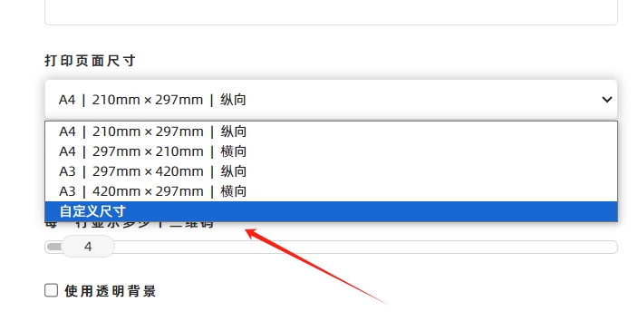 如果需要指定页面尺寸,点击【打印页面尺寸】下拉选择【自定义尺寸】,填写导出页面的宽度与高度。