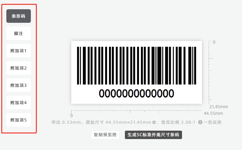 此工具的界面的左边栏是条形码的配置项,包括【条形码】、【脚注】和5项【附加项】的分栏配置项。