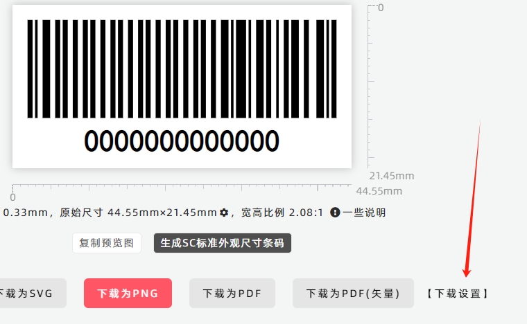 工具界面的右侧是条形码的预览图,配置完成设置后,会实时生成条形码预览图。预览图下方是条形码的尺寸信息,此显示的尺寸是预览图的尺寸,此尺寸并非最终导出尺寸,仍然可以点击界面底部的【下载设置】修改导出尺寸。