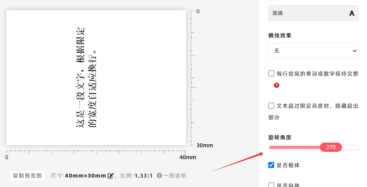 如果需要文字旋转显示,可以调节【旋转角度】配置项,如下图。
