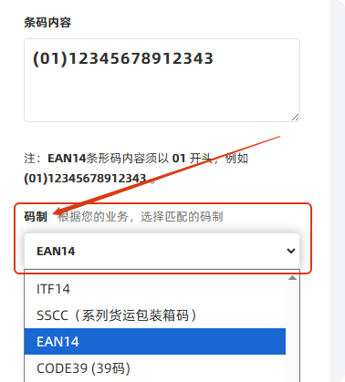 多零的条形码生成器(单件版)、批量条形码生成器、标签生成器,都可以制作EAN14条形码,只需要在条形码【码制】选项中选中“EAN14”码制即可,如下图所示。