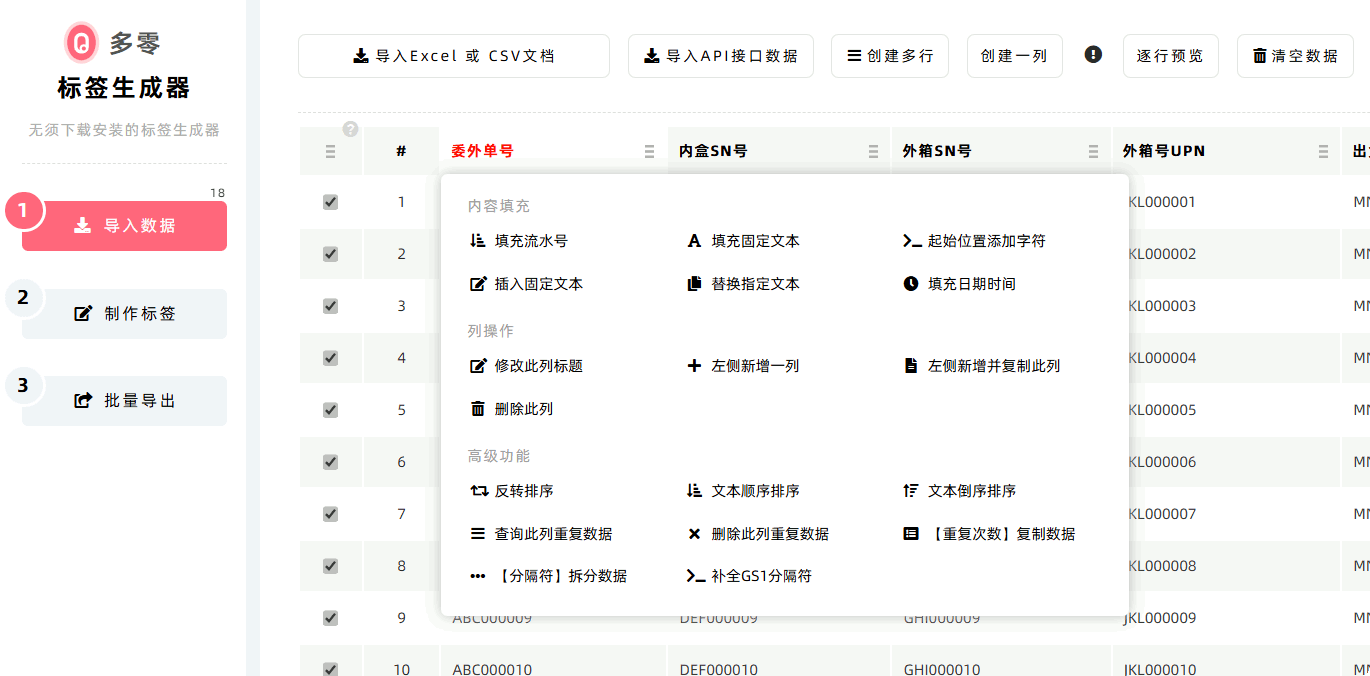 【导入数据】模块提供数据批量导入的实用功能,主要分为三类功能:批量导入已有数据、人工创建编辑数据,以及导入API接口数据。 如果您已将标签数据保存在Excel、CSV文档中,可以在【导入数据】中快速批量导入; 您也可以使用数据编辑功能,人工创建标签数据,例如生成流水号、复制行数据、排序、去除重复行数据等。 除此之外,如果您希望导入您单位内部业务系统的数据,可以使用多零提供的API接口,将数据主动推送到多零标签生成器中,详情请点击了解:如何导入API接口数据。