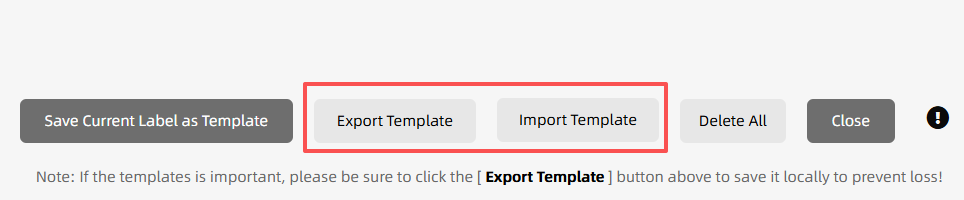 - Export: Click [Export Template] to export the saved label template as a file, which will be saved to your computer’s hard drive.