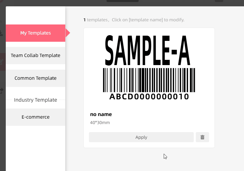 1. Go to the [My Templates] operation page. 2. Hover your mouse over the saved label template—an [Apply] button will appear. 3. Click [Apply] to replace and overwrite the current label with the saved template.