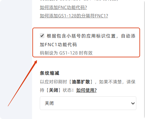 勾选【根据包含小括号的应用标识位置,自动添加FNC1功能代码】选项,多零即自动添加FNC1功能代码。